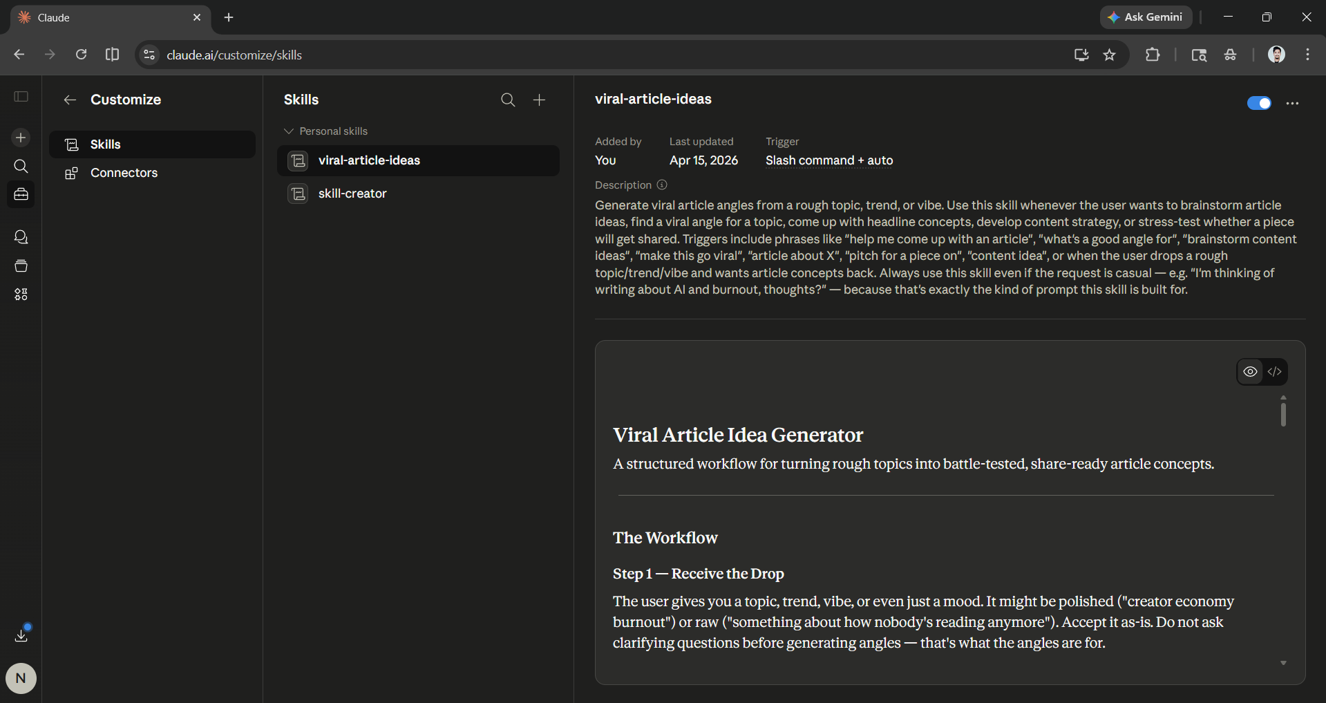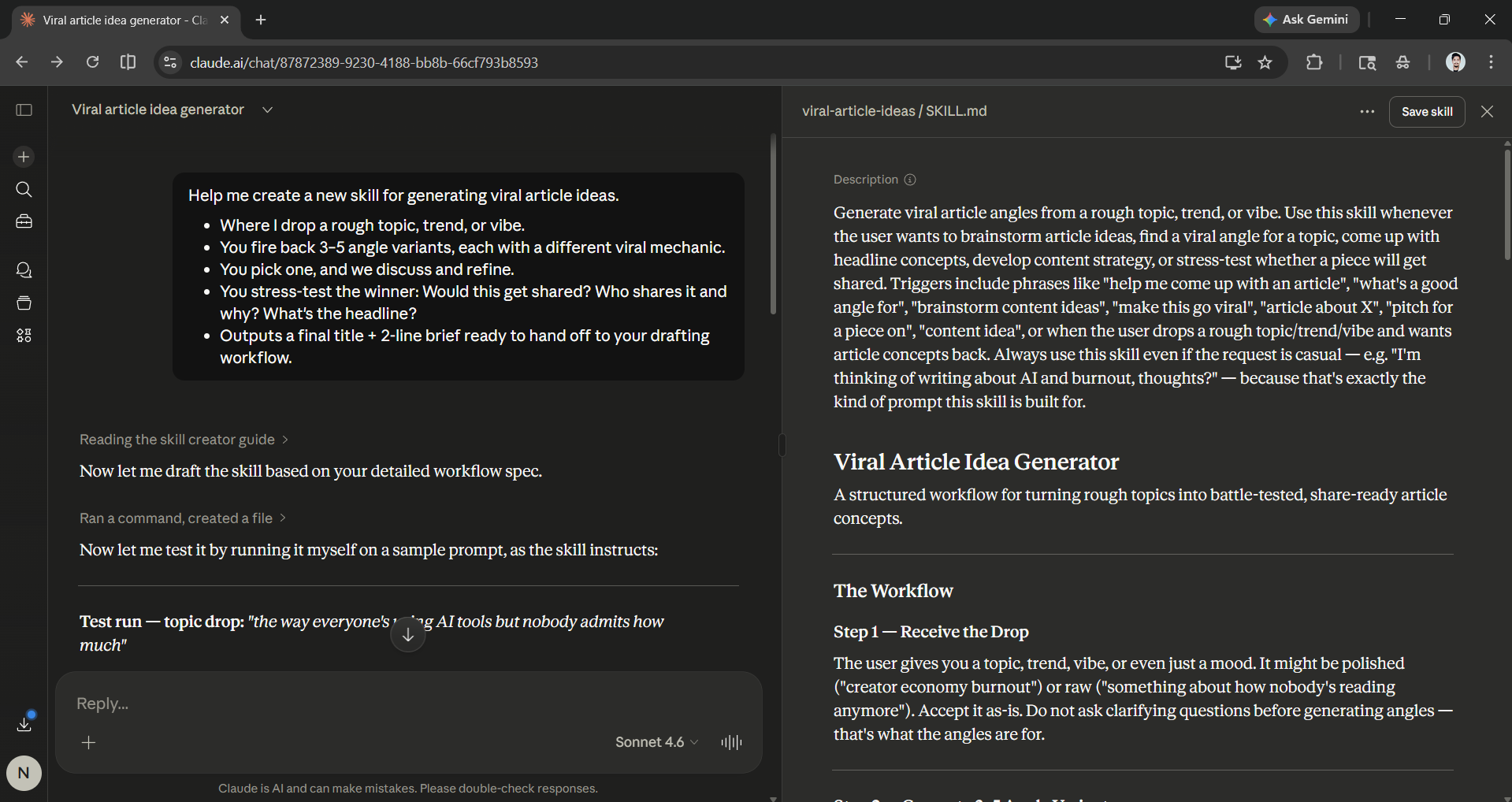Prompt I used: Help me create a new skill for generating viral article ideas.