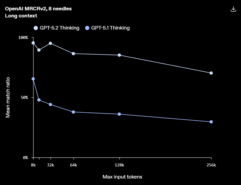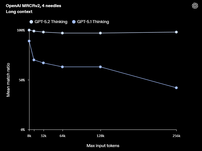 - Long-context reasoning at scale: New state-of-the-art performance on OpenAI’s long-context evals (like MRCRv2), with near-perfect accuracy even when working across hundreds of thousands of tokens.