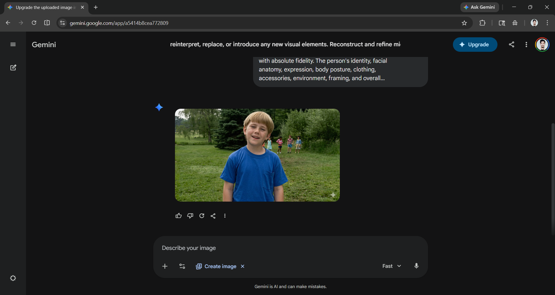 Step 3: Click Create an Image to activate Nano Banana, paste the enhancement prompt directly into the message field, and send.