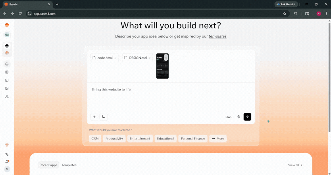 Step 3: Open Base44* and create an account if you haven't used it already. Once you are in, attach the HTML code, UI image, or both (with or without the Markdown file) of the Stitch-generated design you extracted moments ago and prompt Base44 to bring the website to life.