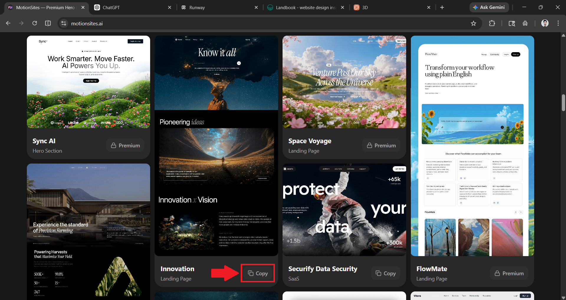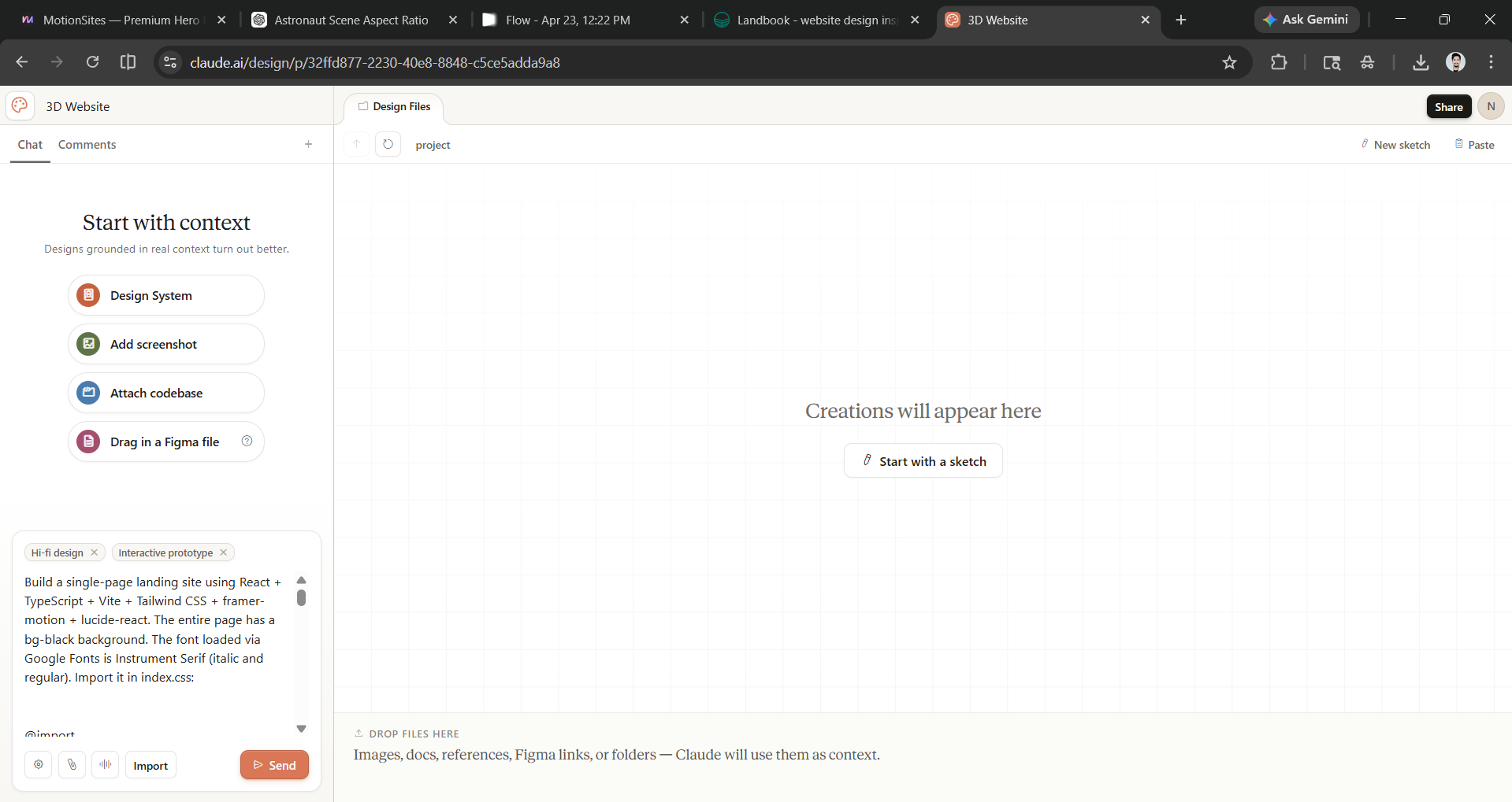 Step 1: Go to Claude Design and create a new prototype. Next, visit MotionSites to find inspiration for your 3D website. Most website prompts are free, where you can click on copy to copy a 3D website's prompt. Paste that prompt in Claude Design's chatbox.