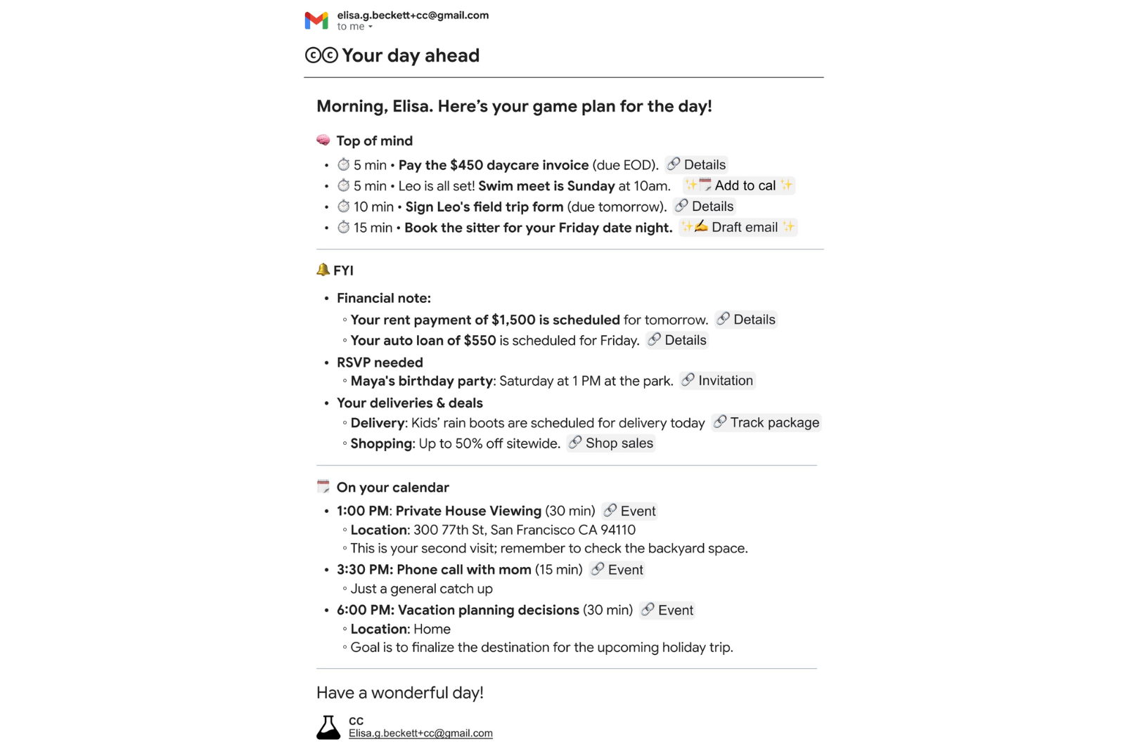 - "Your Day Ahead" Briefing: A morning email that summarizes your schedule, tasks, and essential updates (email drafts and calendar links), helping you start the day with a plan rather than panic.